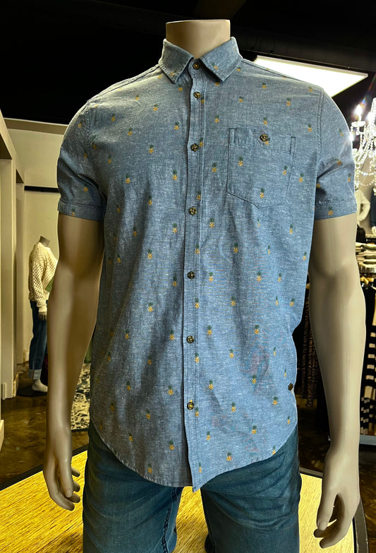 POINT ZERO MEN'S COTTON LINEN PINEAPPLE PRINT SHIRT IN CHAMBRAY