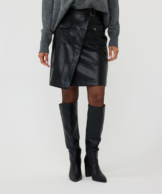ESQUALO VEGAN LEATHER OVERLAP SKIRT IN BLACK