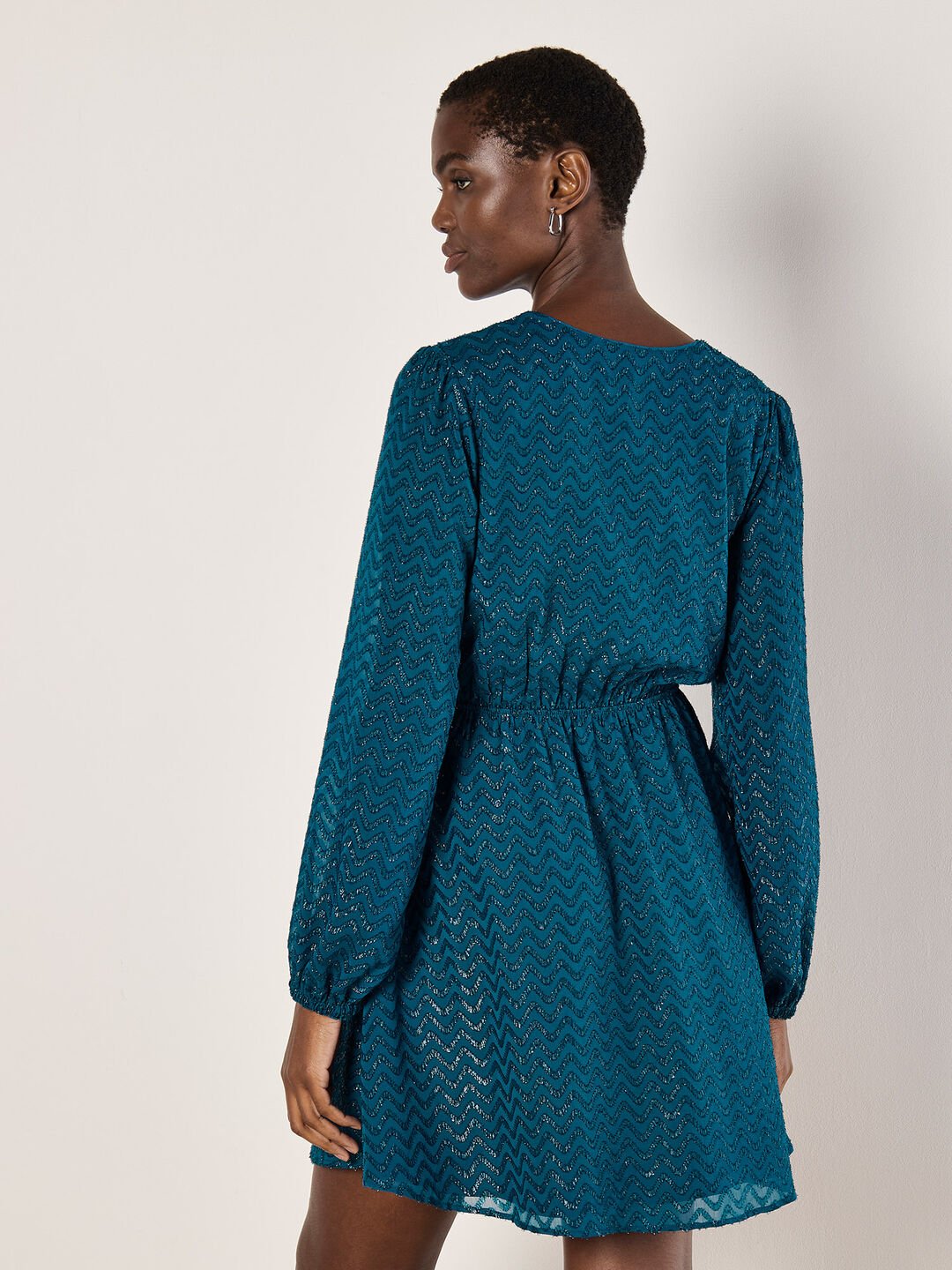 Get ready for party season with this shimmer chevron mini dress. Cut from chiffon and lined for comfort, it features a flattering wrap bodice, an elastic waist, and balloon sleeves. Complete the look with heels and a clutch for effortless after-dark dressing.